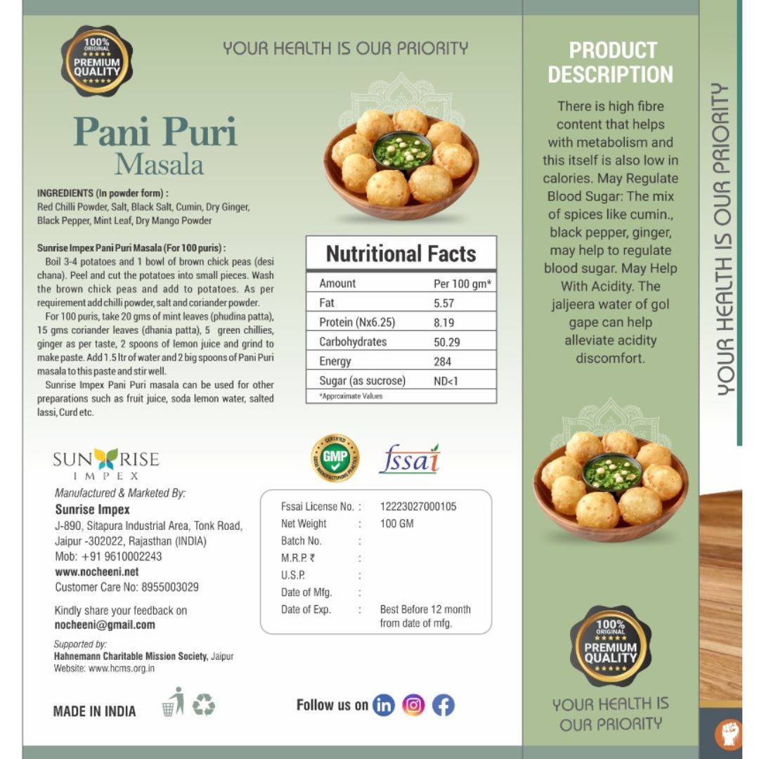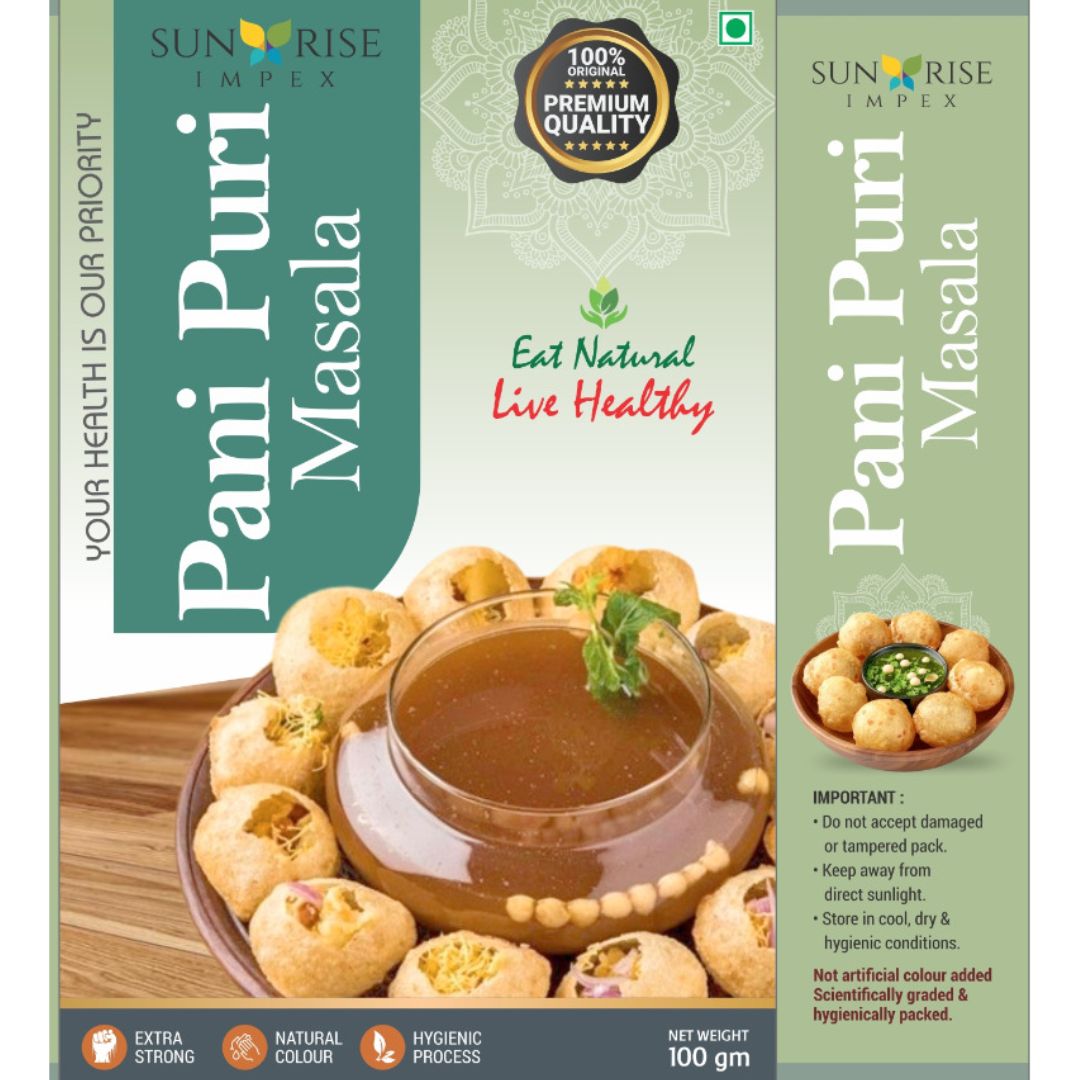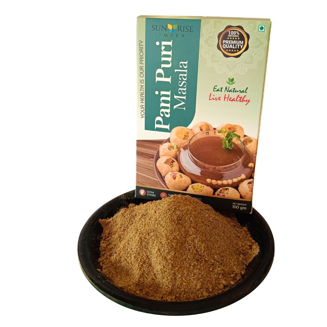 Pani Puri Masala is a premium-quality organic spice blend crafted from carefully selected natural ingredients including red chilli powder, salt, black salt, cumin, dry ginger, black pepper, mint leaves, and dry mango powder. This perfectly balanced blend delivers the authentic tangy, spicy, and refreshing flavour of traditional street-style pani puri. Made from high-quality spices, it enhances taste while also supporting digestion and adding a burst of aromatic freshness to your favourite snacks.