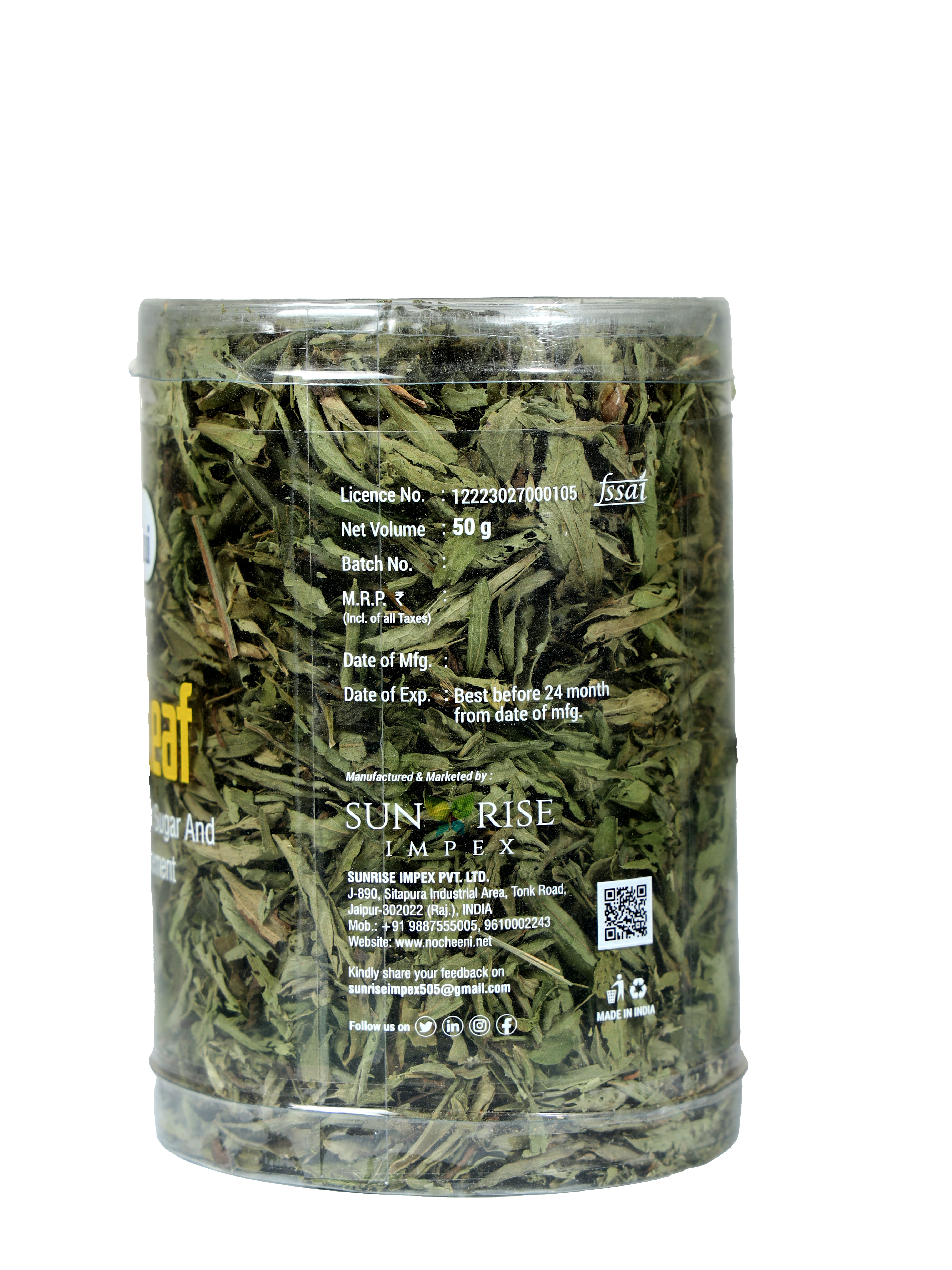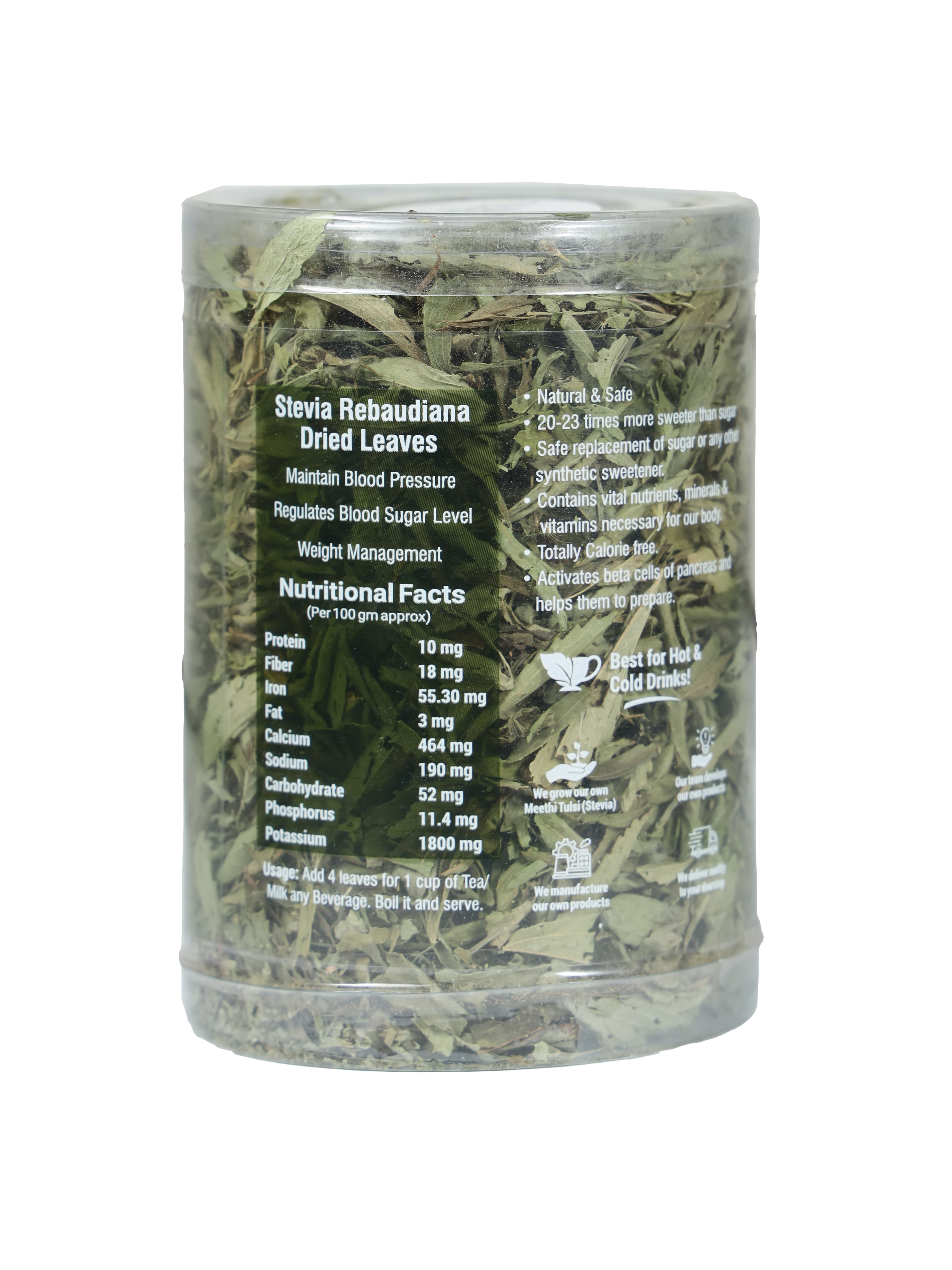 Experience the goodness of nature with our high-quality stevia leaf, a 100% natural, plant-based sweetener that offers intense sweetness without the calories or harmful effects of refined sugar. Carefully sourced from the finest Stevia rebaudiana plants and processed under strict quality standards, our stevia delivers purity, freshness, and consistent taste in every use.
